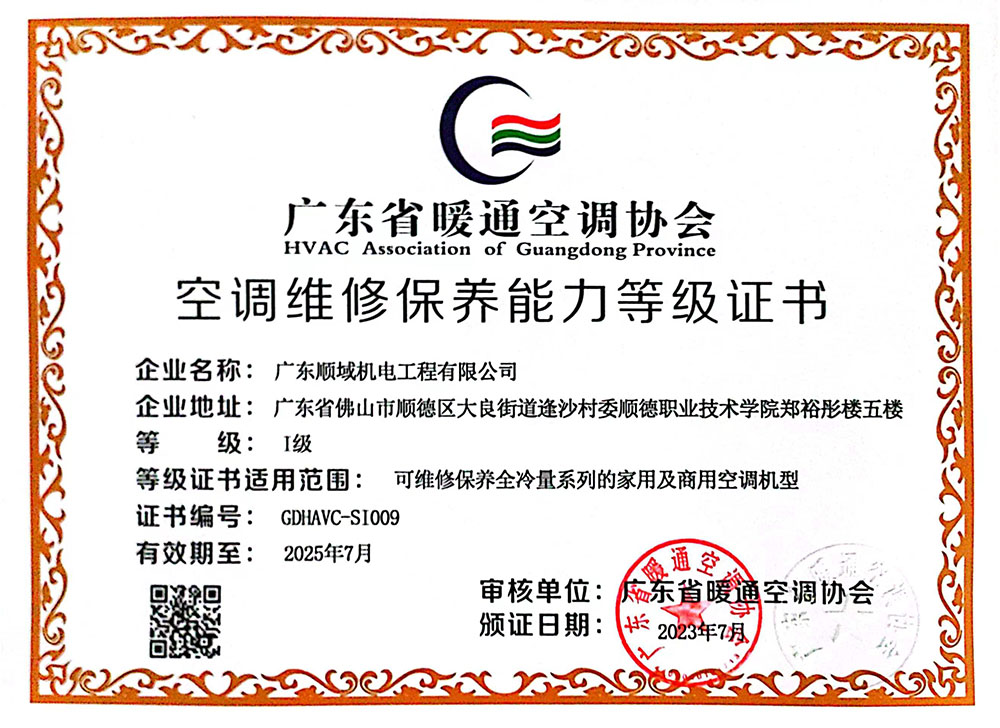 广东省暖通空调协会维修保养证书