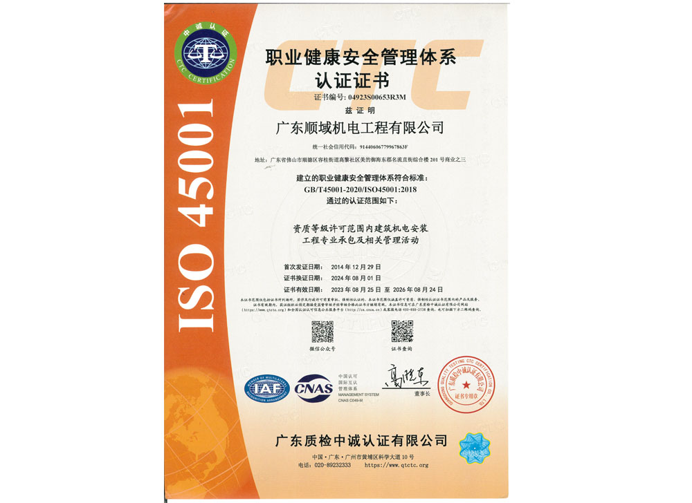 职业健康安全管理体系认证证书